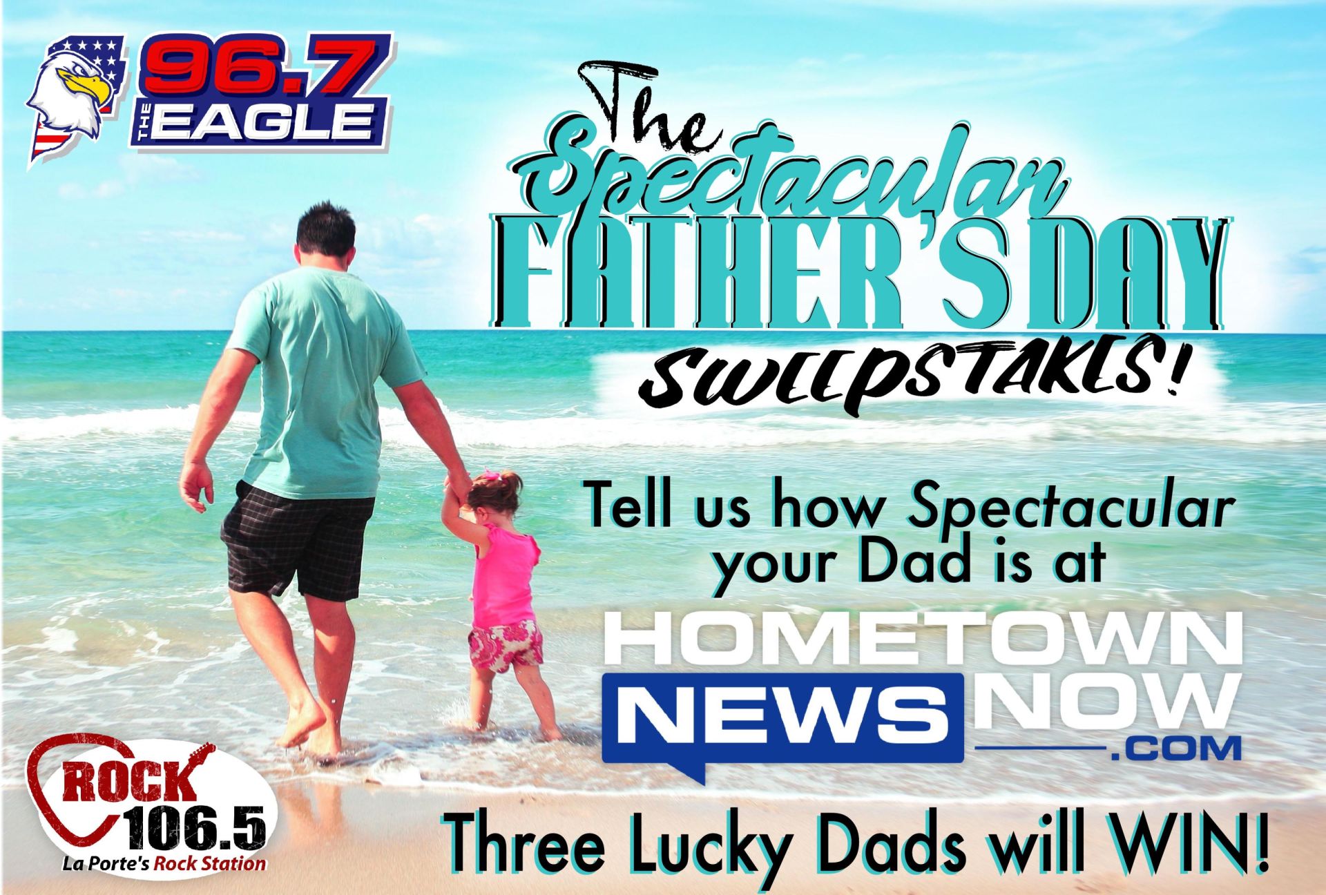 Celebrate Father's Day this year by entering to be one of THREE winners of the "Spectacular Father's Day Sweepstakes " contest. HometownNewsNow.com, 96.7 The Eagle, and the new Rock 106.5 have teamed up with several other local businesses to give you the opportunity to treat a father in your family to an extra special experience following this Father's Day.